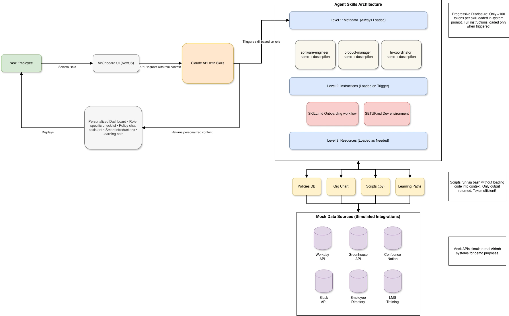The application architecture follows a clean separation of concerns. The Next.js API routes handle communication with the Anthropic API, managing skill discovery and invocation. The frontend provides a chat-style interface where new hires can ask questions naturally, with the agent intelligently loading only relevant skills and content.