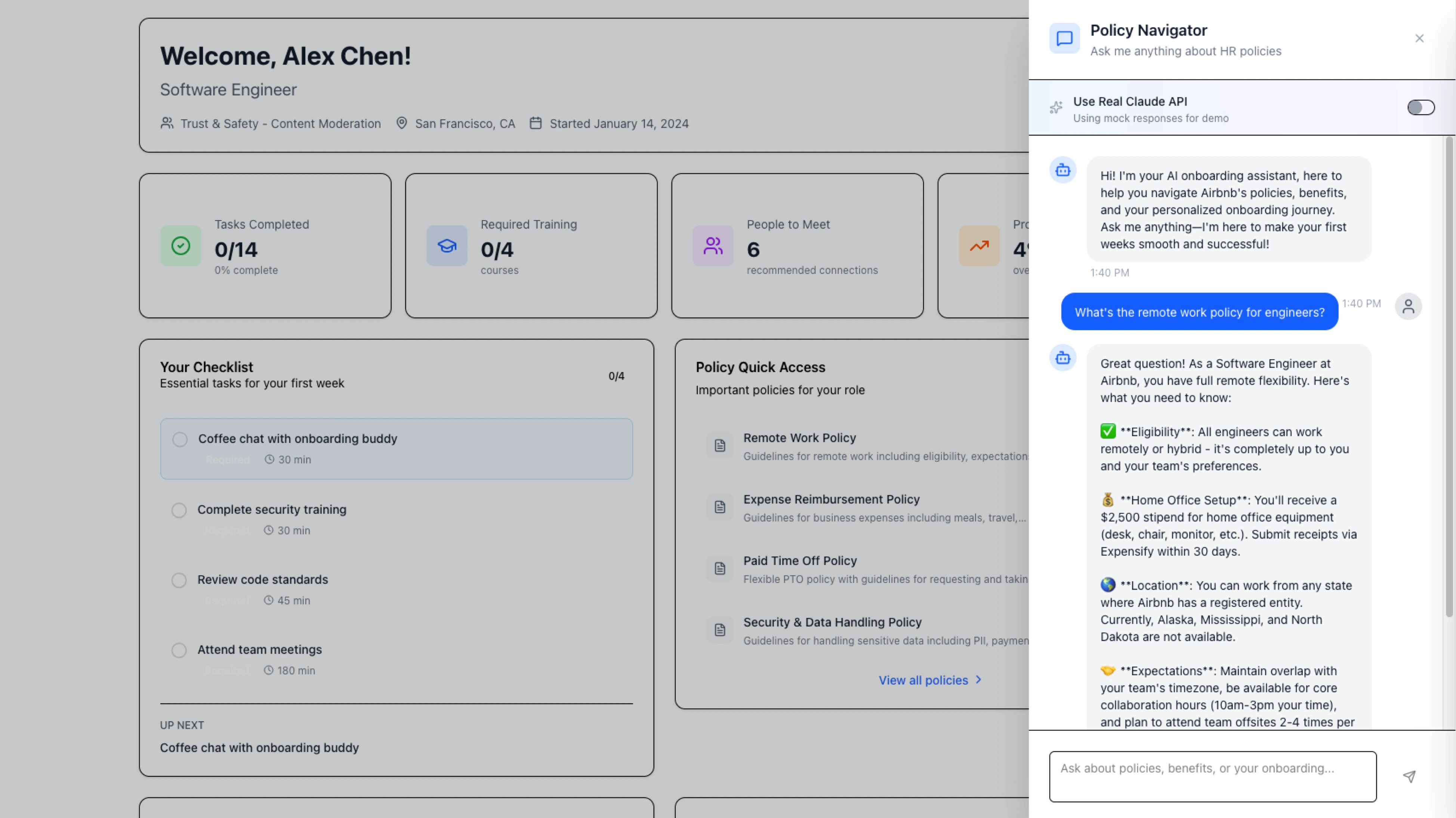 The interface was designed to feel natural and conversational, removing friction from the onboarding experience. New hires interact with the system through a clean chat interface that feels familiar to anyone who has used modern messaging apps.