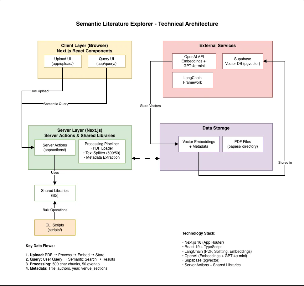 The Semantic Literature Explorer addresses this challenge by building a vector-database-backed research instrument that enables semantic exploration of academic literature. Rather than being a production tool, it serves as a practical learning project to understand how RAG systems actually behave when implemented.